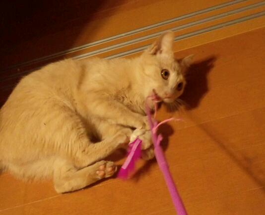 釣り竿に羽根が付いてるのとか、キャットニップ入りのオモチャとか食いつきよすぎで怖い。